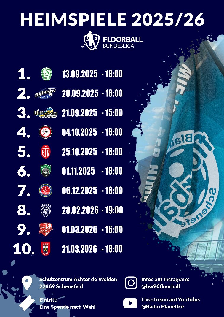 Floorball – oft auch Unihockey genannt – ist eine schnelle und moderne Teamsportart, die in einer Halle auf einem Feld mit Banden gespielt wird. Zwei Teams versuchen, mit speziellen Leichtschlägern und einem Kunststoffball Tore zu erzielen. Floorball kombiniert die Dynamik von Eishockey mit der Leichtigkeit des Hallensports und begeistert durch Schnelligkeit, Technik und Teamgeist. In Skandinavien gehört Floorball bereits zu den beliebtesten Sportarten, und auch in Deutschland wächst die Community rasant – besonders dank Vereinen wie BW96 Schenefeld, die in der 1. Bundesliga spielen.