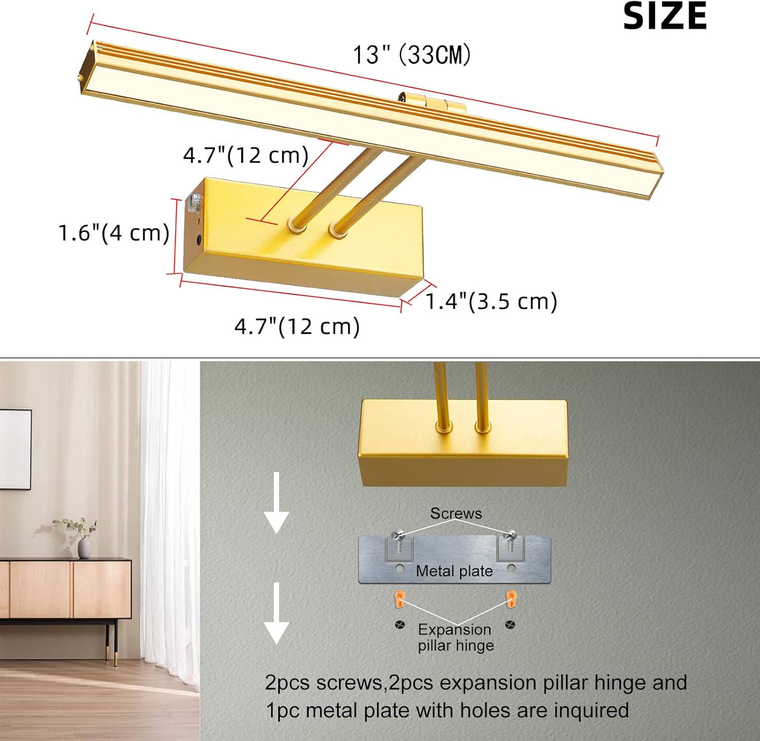 MORE DETAILS * Material: Metal and Aluminum * Power Source: rechargeable battery * 3000K warm white LED. 1.1W, 280Lumens * Each light tube can be turned 150° up or down, rotate each light head independently to desired angle. * Installation Steps: 1. Drill two pilot holes in the location where you want to mount the picture light. Place screws (included) in pre-drilled holes. Tighten slightly until secure, but do not tighten all the way. Slide EZ Mount Bracket 2. Once you confirm that the bracket is level, tighten the screws to secure it to the wall. Take care not to over tighten. 3. To hang the picture light on the mounting bracket, align the picture light with the mounting bracket and slide the unit down. Picture light will lock into position. 4. To remove the picture light from the mounting bracket: A) Hold the picture light by the base (not light head). B) Slide the unit up. C) Once the body releases from mounting bracket, pull the unit out. PACKING LIST - 1 x Picture Light - 1 x Remote Control - 2 x Screw - 1 x User Manual