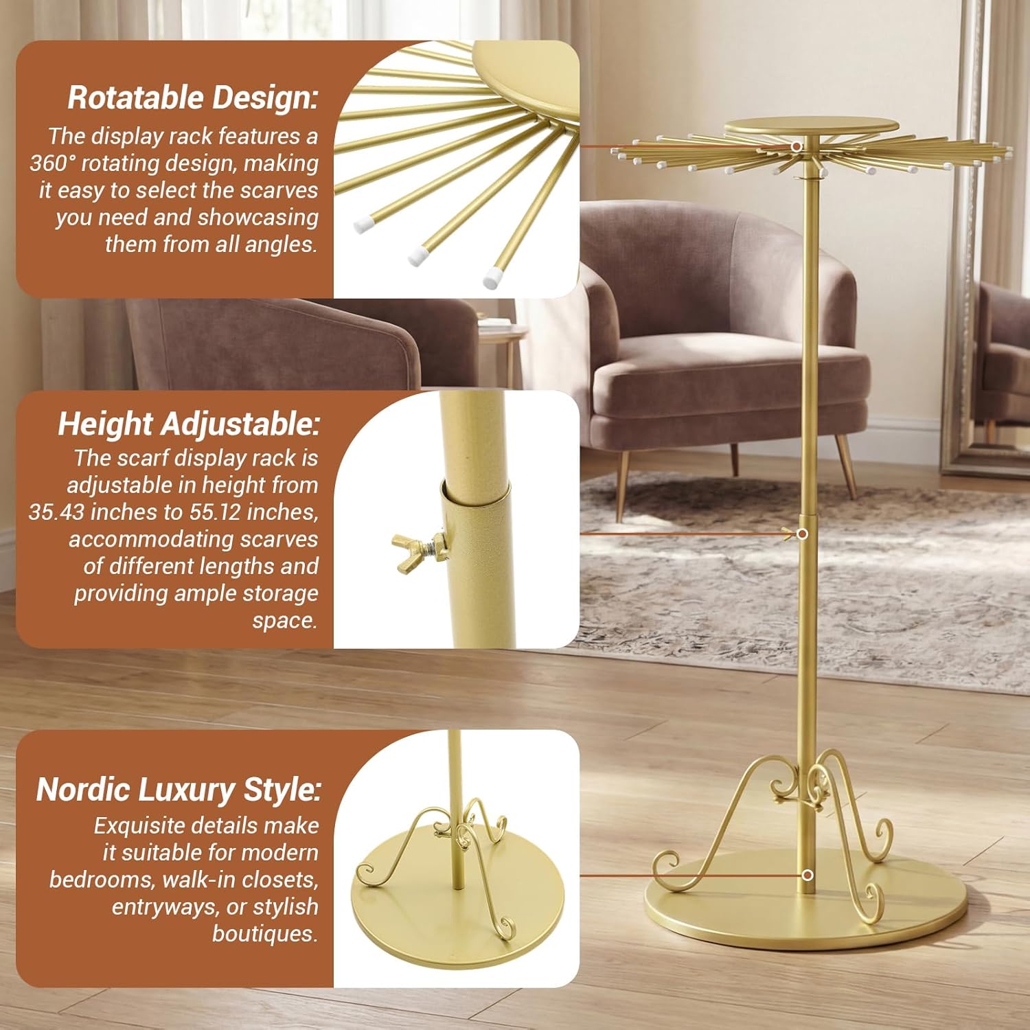 Features: Dual storage Top Disc for Extra Convenience: Designed with a top disc, the scarf rack adds an extra storage area besides the 30 hanging rods. You can place small objects like potted plants, small bags, shoes and ornaments on it, realizing the integration of decoration, storage and display. The dual-storage design makes the stand more functional for both practical use and aesthetic display. Stylish Gold Appearance for Elegant Decoration: Featuring a unique round structure and a glossy gold exterior, the scarf display has a striking visual appeal that adds a touch of luxury and elegance to your room or store. Its stylish design not only serves as a practical storage tool but also acts as a decorative piece, fitting well with different home or commercial decoration styles. Specifications: Material: iron Color: gold Size: height is adjustable between 35.43–55.11 inches Package includes: 1 x Scarf rack with 30 rods Notes: Manual measurement, please allow slight errors on size. The color may exist a slight difference due to different screen displays. Check the size before ordering
